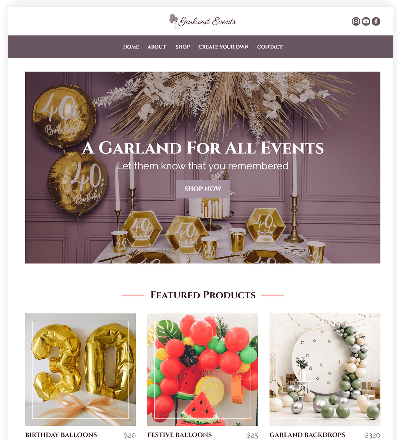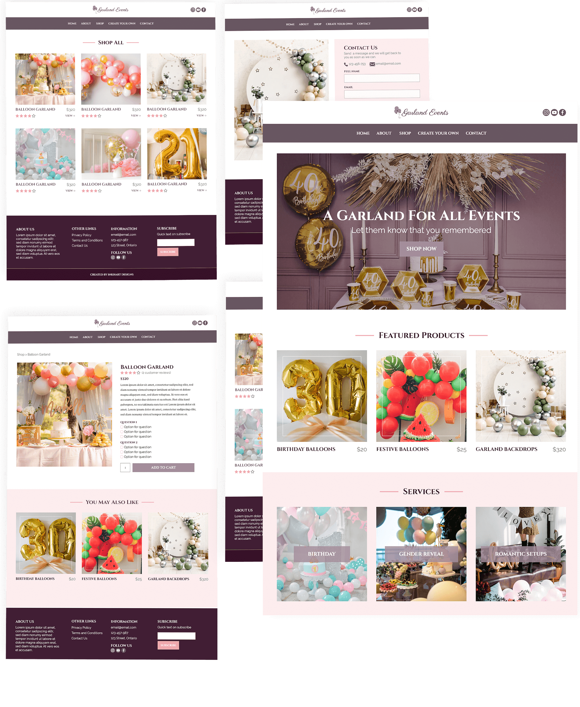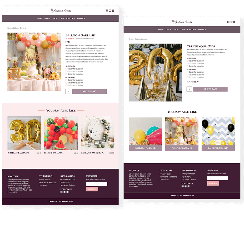 This is a demo web design for a balloon decoration business. The business offers services and also sells customised products. The layout is clean with pink and purple tones to add some softness to the look.