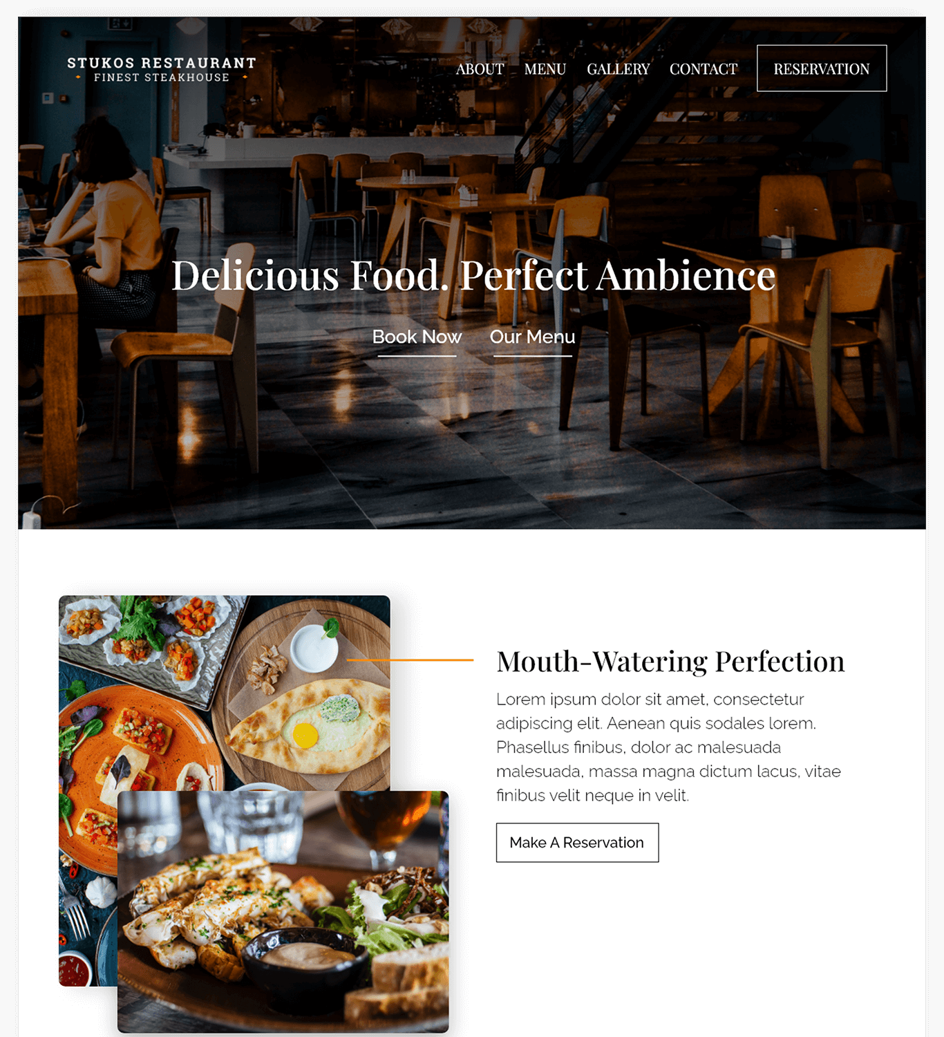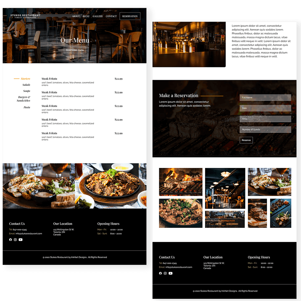 The design for Stukos Restaurant was inspired by the dark and charred look of grilled food. This design will be used to make a simple custom WordPress theme for restaurants.